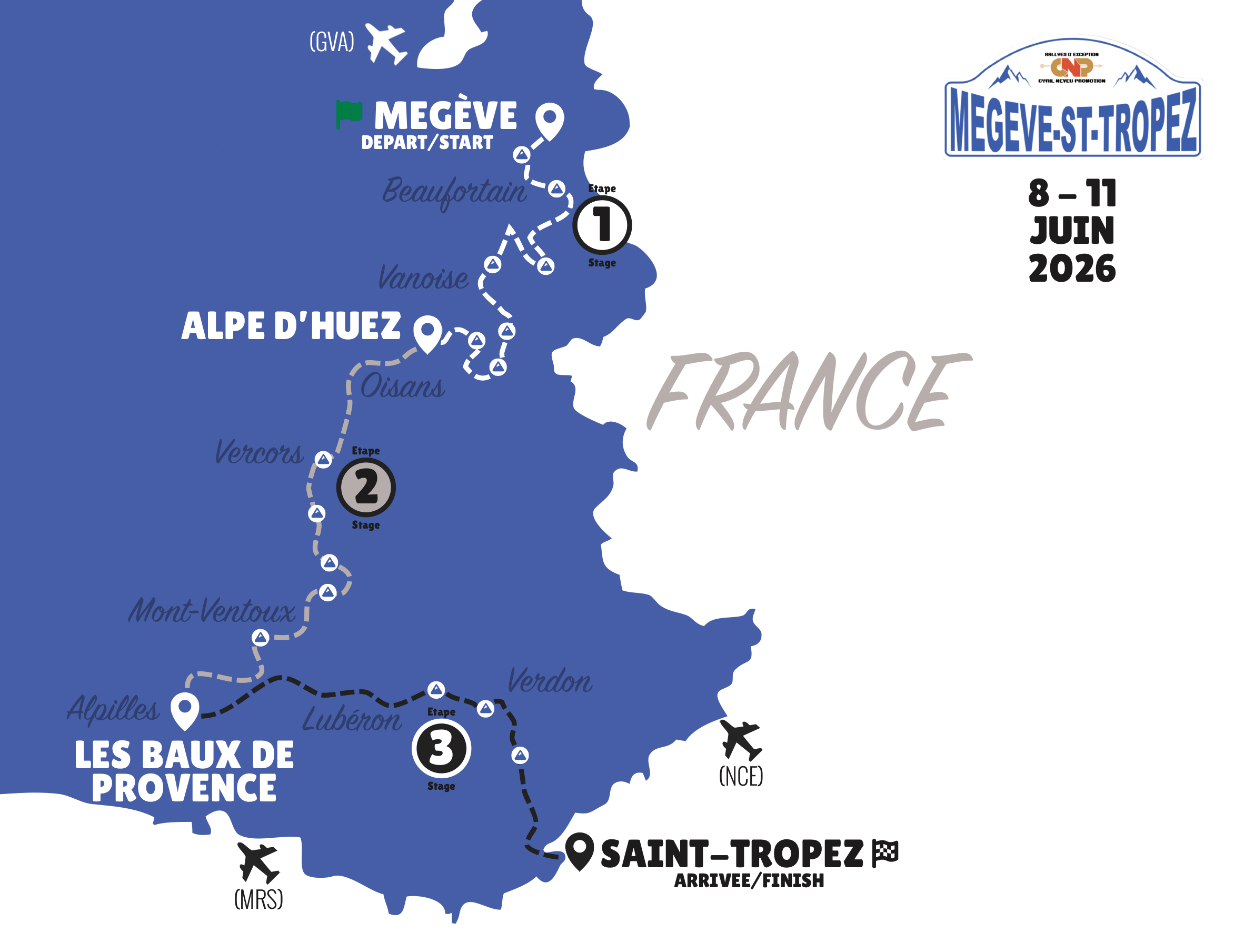 MEGEVE > ALPE D’HUEZ > LES BAUX DE PROVENCE > SAINT-TROPEZ